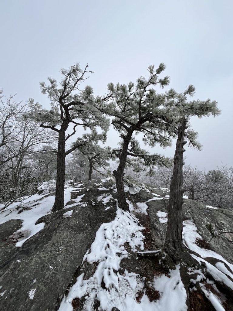 Gabe Parrish, Avery Catherwood, and Gabe Small in Hanging Rock State Park, NCStunted Table Mountain Pine growing at Hanging Rock State Park, NCDr. Tommy Patterson and Avery Catherwood next to a Virginia Pine at Stone Mountain State Park, NC
